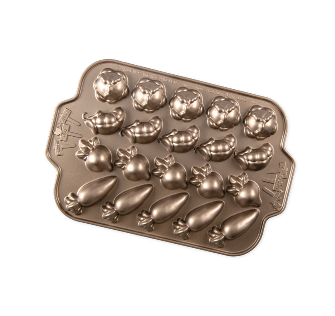 Bake a bushel of bite-size veggies using your favorite batter. Makes 20 adorable cakelets shaped like carrots, radishes, pea pods, and cabbages. Perfect treat for springtime festivities!