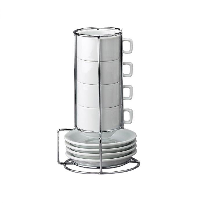 - Made from fine-quality porcelain; lead and cadmium free; set of 4 cups (3.5 x 2.75 x 2-inch, 4-ounce) with matching saucers and chrome storage stand