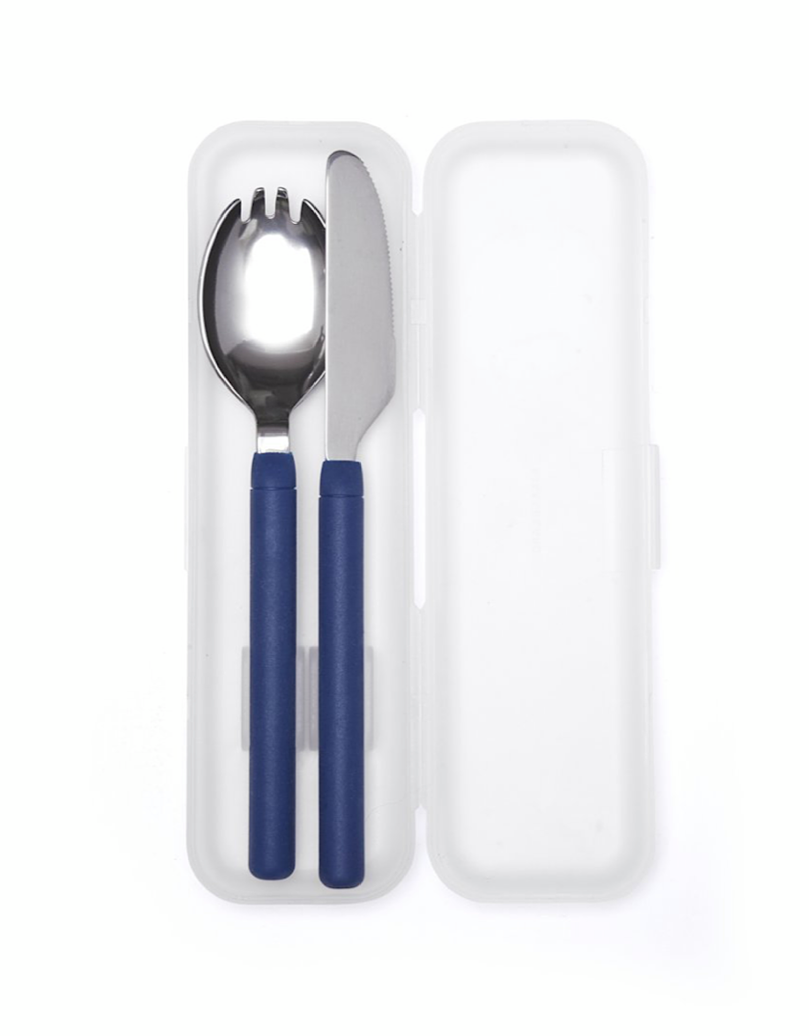 Be Eco-Friendly and eliminate disposable, plastic utensils that fill up the landfills. These soft-grip spork & knife utensils can be used almost anywhere: breakfast, lunch, dinner or picnics. Comes with handy frosted carrying case that easily fits into your bag. Made of stainless steel with silicone handles.