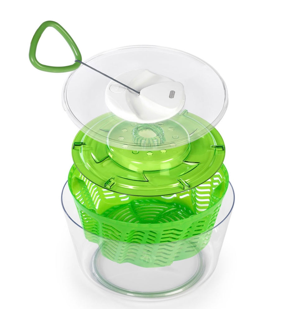 The Zyliss Easy Spin 2 AquaVent Salad Spinner works by the use of a newly designed ergonomic handle which pulls to activate the basket to spin. With just one full pull, the basket spins incredibly fast with minimal effort.