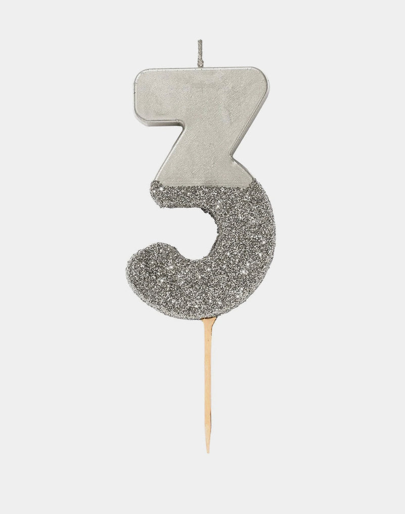 Perfect for a 3rd birthday party or mix and match this number silver candle with other numbers.